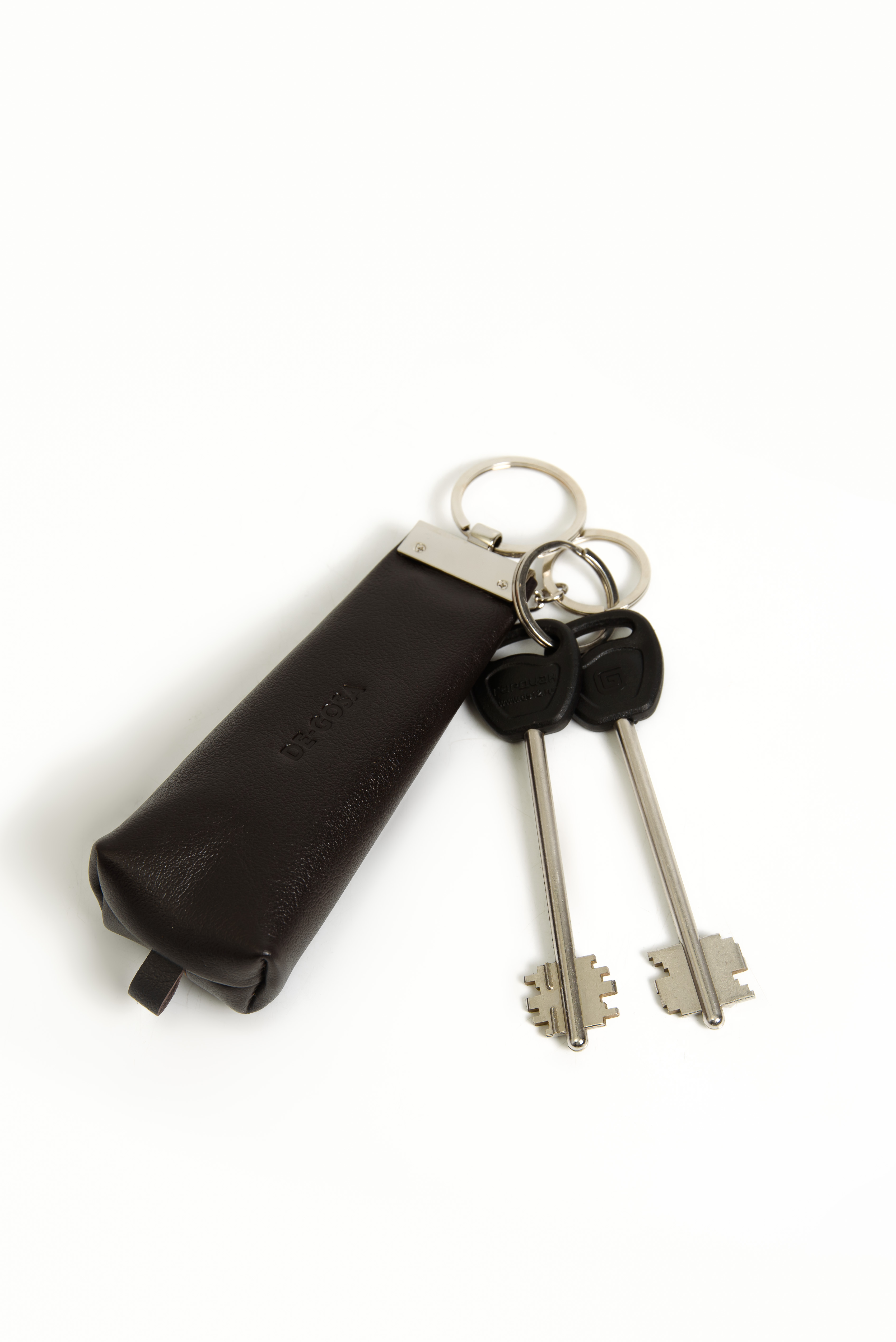 Компактная ключница на замочке из натуральной кожи бренда De-Gosa. Снаружи предусмотрено кольцо для крепления. Внутри два кольца на цепочке для крепления ключей.